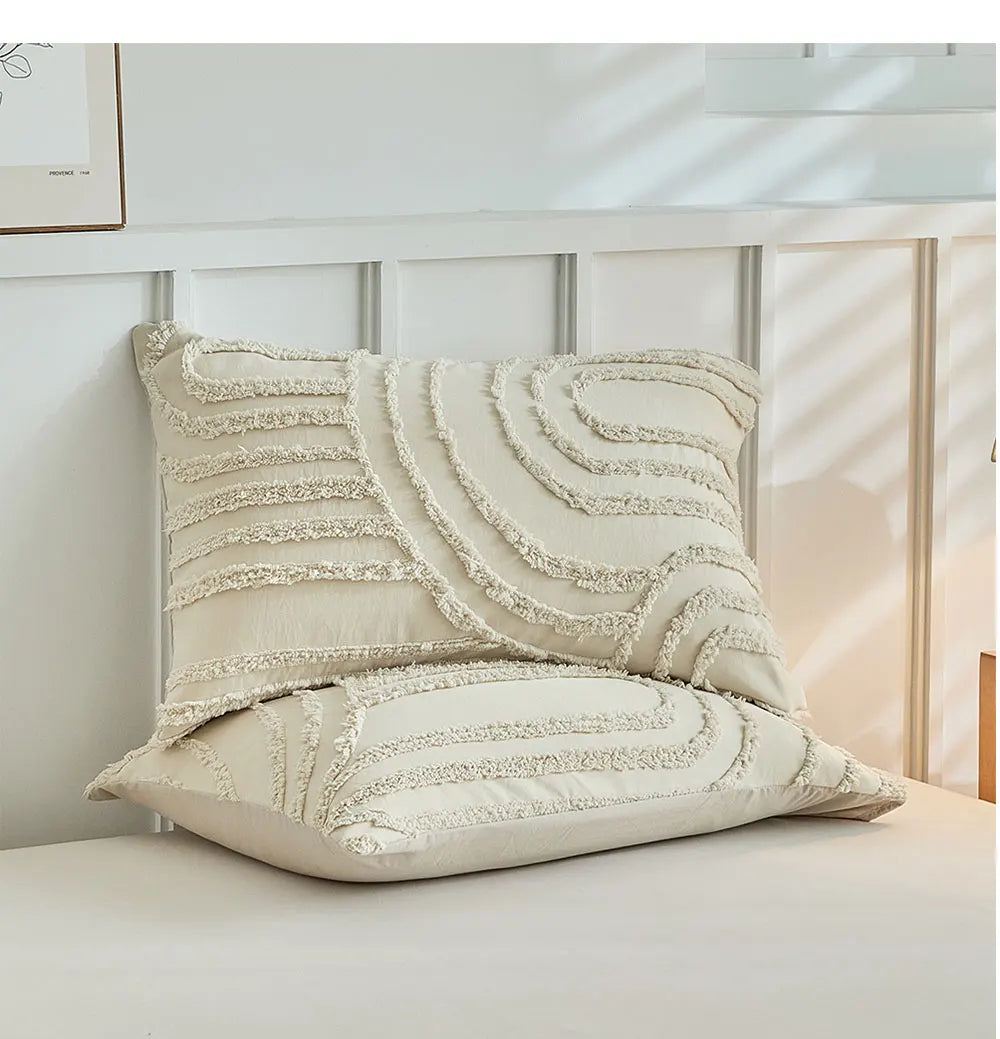 The ArcLoom Serenity Duvet Set embodies the beauty of calm geometry and artisanal craftsmanship. Its soothing arched tufted patterns flow gracefully across the fabric, creating a sense of balance, warmth, and harmony. Each curve is intricately formed through the Tatting weaving technique, giving the design a rich, raised texture that feels soft to the touch while adding depth and character to your space.