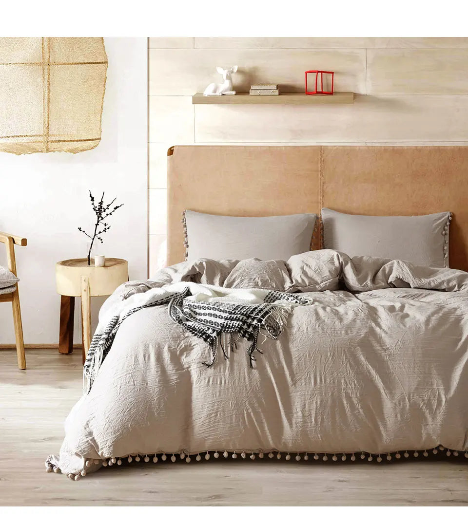 Pom-Pom Cloudscape Duvet Set turns your bedroom into a soft, airy retreat where comfort and simplicity come first. Designed with a relaxed, lived-in texture, the fabric drapes beautifully over the bed, creating a cloud-like look that feels effortless and inviting. Each edge is finished with charming pom-poms, adding a playful handcrafted touch that blends seamlessly with boho, farmhouse, and minimalist décor styles.