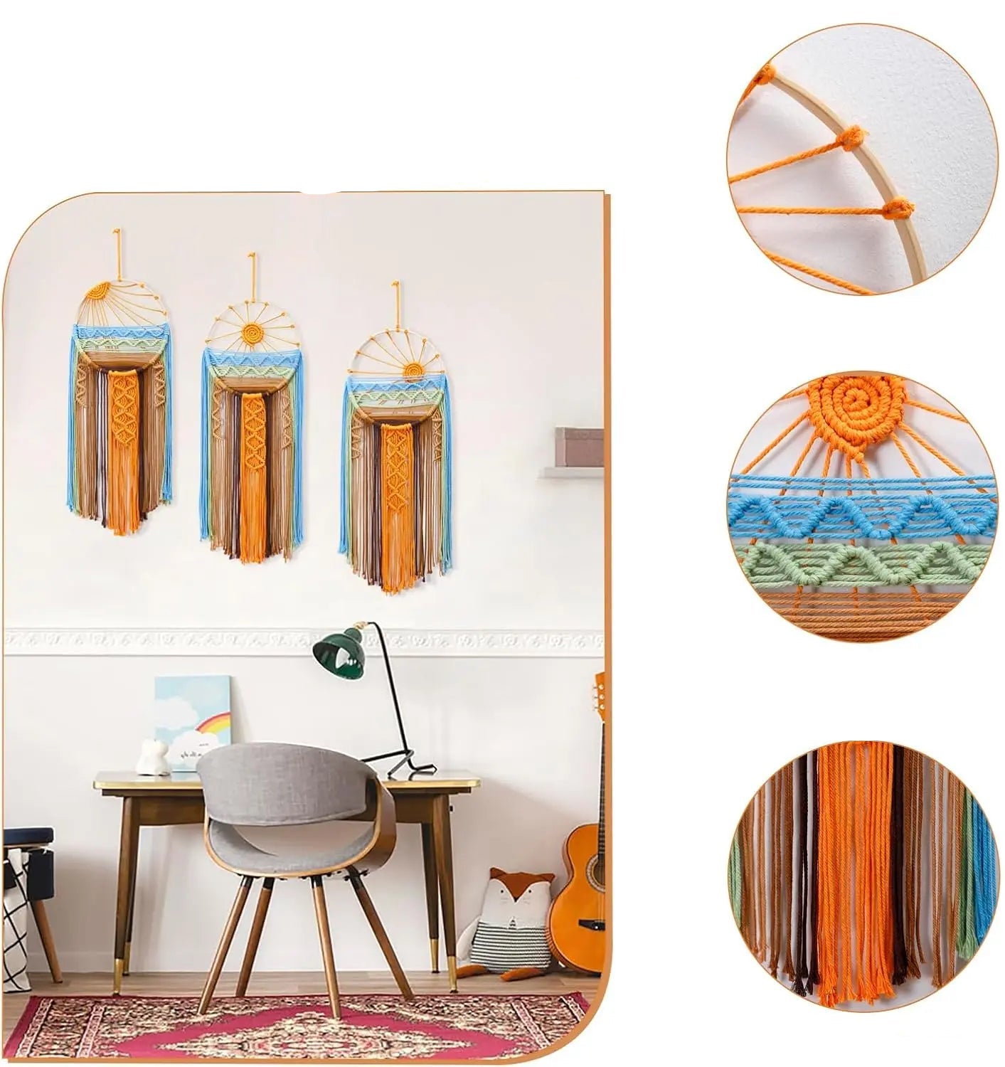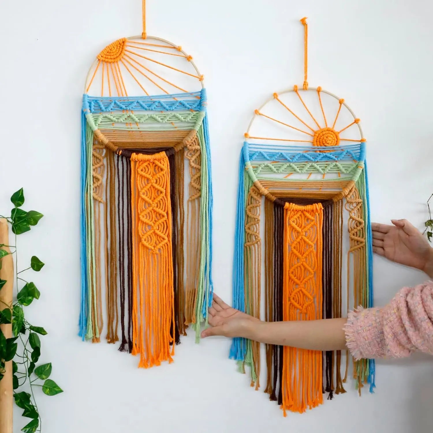 Handwoven from gentle cotton threads, it captures the soul of a rising sun, golden warmth meeting tranquil blue, where night surrenders to light. Each strand falls like a quiet prayer, a flow of peace and renewal that softens the energy of any room.