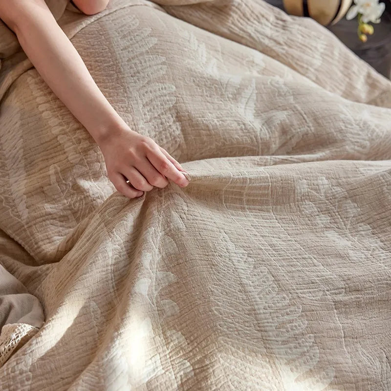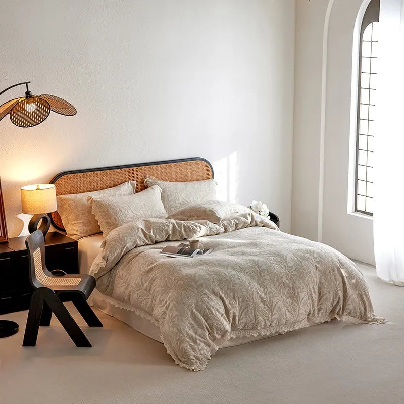 The Whisper Fern Jacquard Duvet Set captures the quiet poetry of nature through its refined texture and soothing palette. Each piece is woven with Tatting craft, a delicate and meticulous weaving technique that adds subtle depth and durability to the fabric. With a 500-thread count construction, it delivers a silky smooth feel while maintaining the natural breathability that ensures year-round comfort.