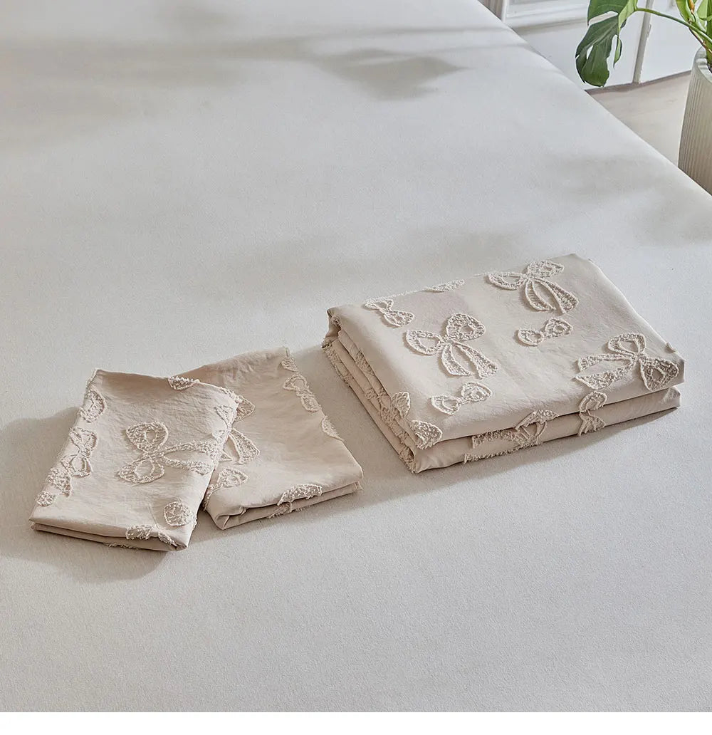 Blush Ribbon Whisper Duvet Set is made for those who want their bedroom to feel like a peaceful escape, with gentle textures, soft hues, and a handcrafted touch. It transforms your bed into a place where elegance and comfort live together beautifully, where every morning starts soft, and every night ends in comfort.