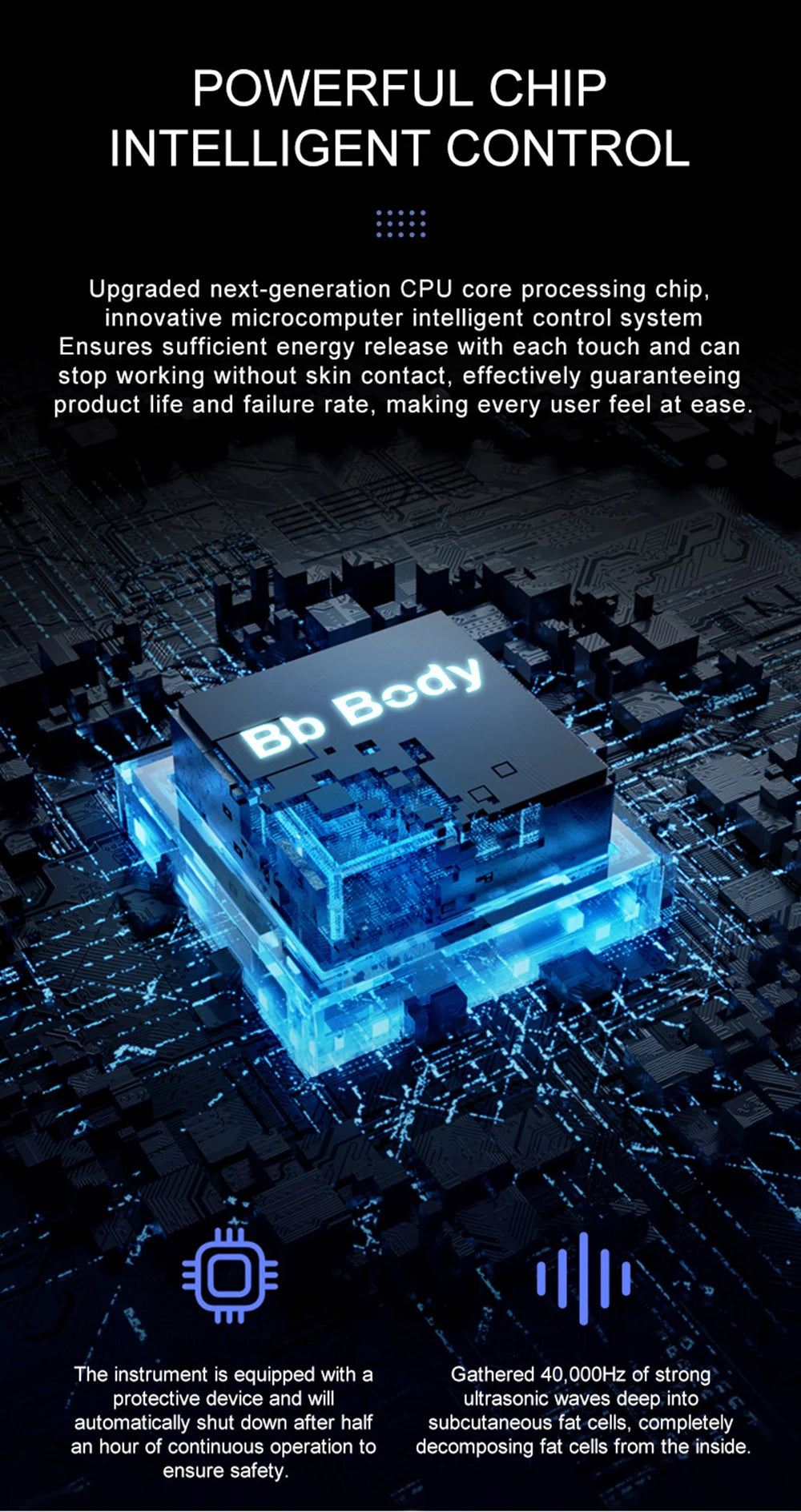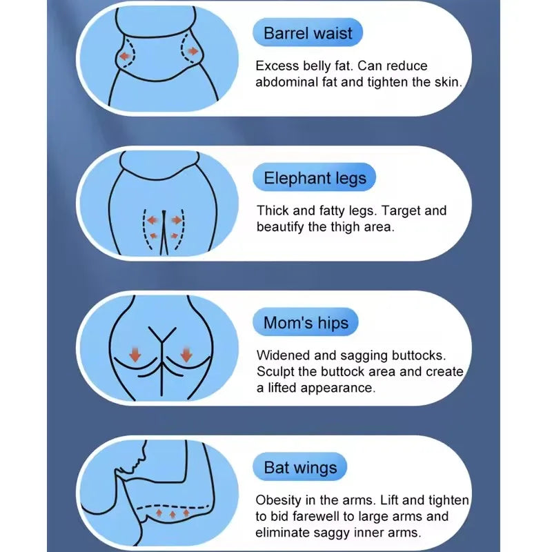 It works by sending deep ultrasonic waves into the skin to help break down fat deposits, while its integrated vacuum massage lifts, sculpts, and stimulates circulation. As the device glides along the waist, thighs, arms, back, and hips, it supports lymphatic drainage, helps smooth out dimples, and encourages a more defined silhouette. Over time, this combination makes the skin appear tighter, the body more sculpted, and the treated areas visibly reduced in size.