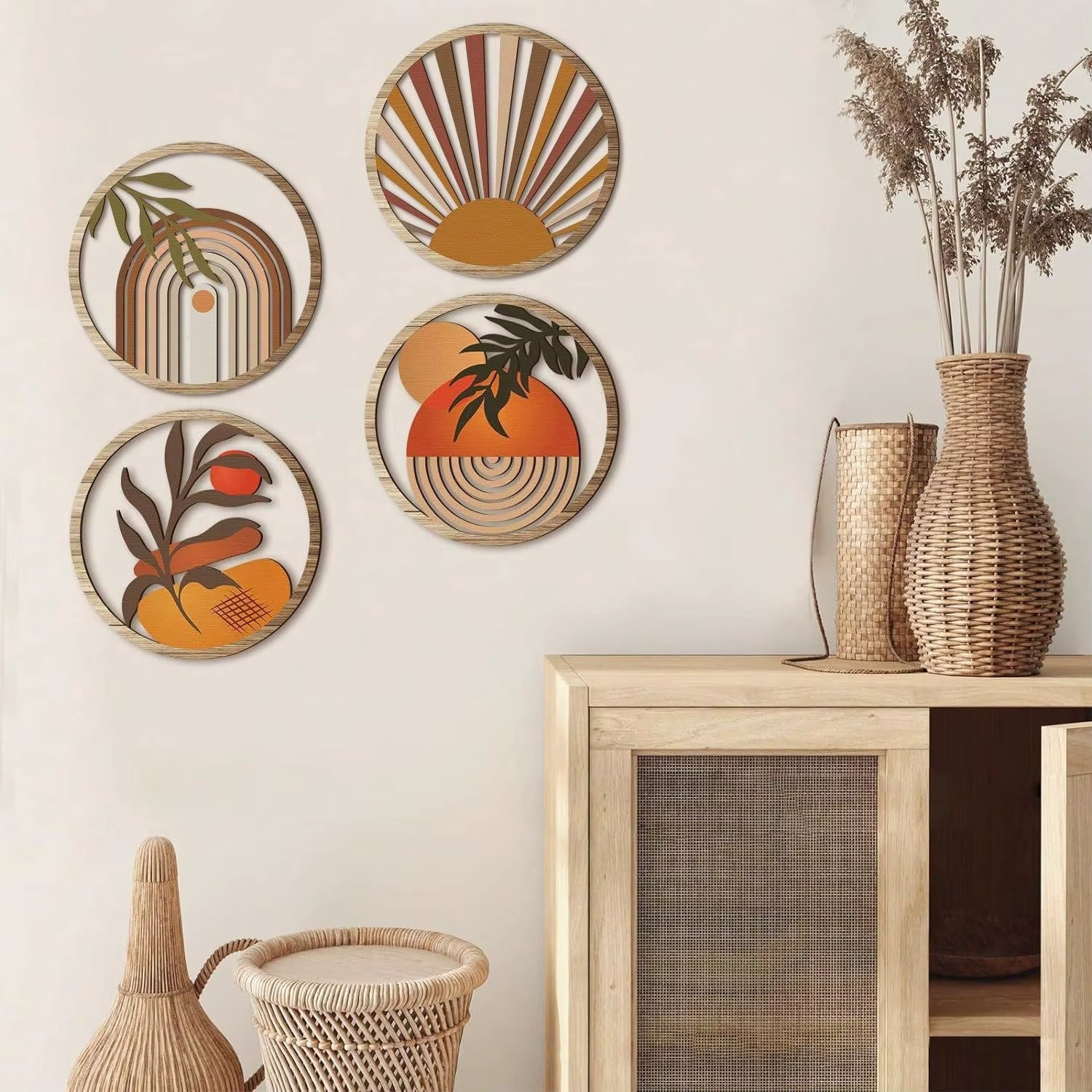 Transform your walls into a canvas of warmth and serenity with the Golden Horizon Wall Art Collection. This four-piece set features handcrafted round frames that blend modern geometry with organic shapes, creating a striking balance between nature and design.