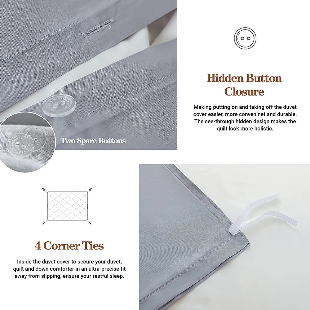 Designed with practical details, the duvet cover includes four interior corner ties to keep your comforter securely in place and a hidden button closure for a clean, seamless look. The high-quality cotton fabric resists shrinking and fading, maintaining its shape, softness, and color over time.